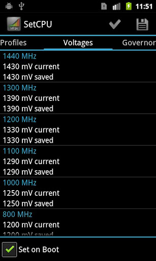 SetCPU for Root Users also includes a "voltage control" menu, available to certain devices with custom kernels that support it, to control undervolting to save even more battery. Keep in mind that undervolting is only available for certain kernels.
