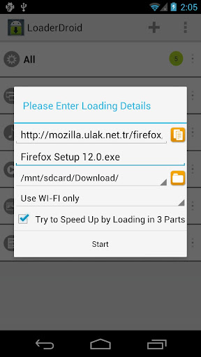 Loader Droid download manager can solves many problems with the standard Android Browser, which is sometimes unable to load files (including e-books, video streams, audio, applictions, zip files, etc.)