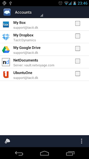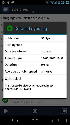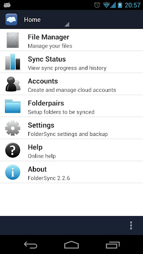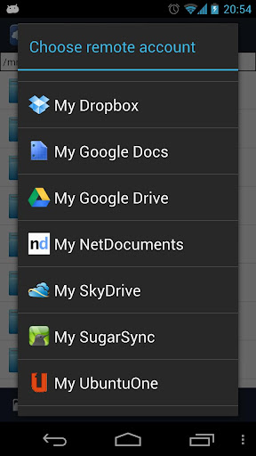 FolderSync apk is a application that enables simple sync to cloud based storage to and from local folders on the device memory card. It currently support multiple SkyDrive, Dropbox, SugarSync, Ubuntu One, Box.net, LiveDrive, HiDrive, Google Docs, NetDocuments, Amazon S3, FTP, FTPS, SFTP, WebDAV or windows share (Samba/CIFS) accounts, and support for more platforms are planned. Read-only access to protected file-system also supported - requires root.