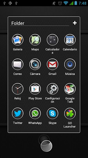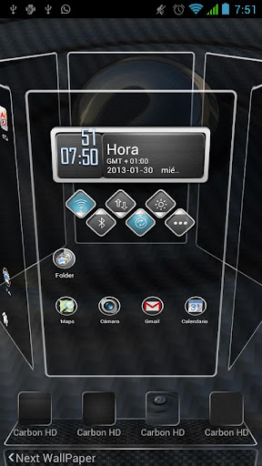 1. Make sure the Next Launcher Theme Carbon HD V1.15 of Next Launcher has been installed! (Search “Next Launcher” to download)2. Apply the Theme: MENU->Indicidual—>Installed themes->Choose Carbon Circle HD theme.
